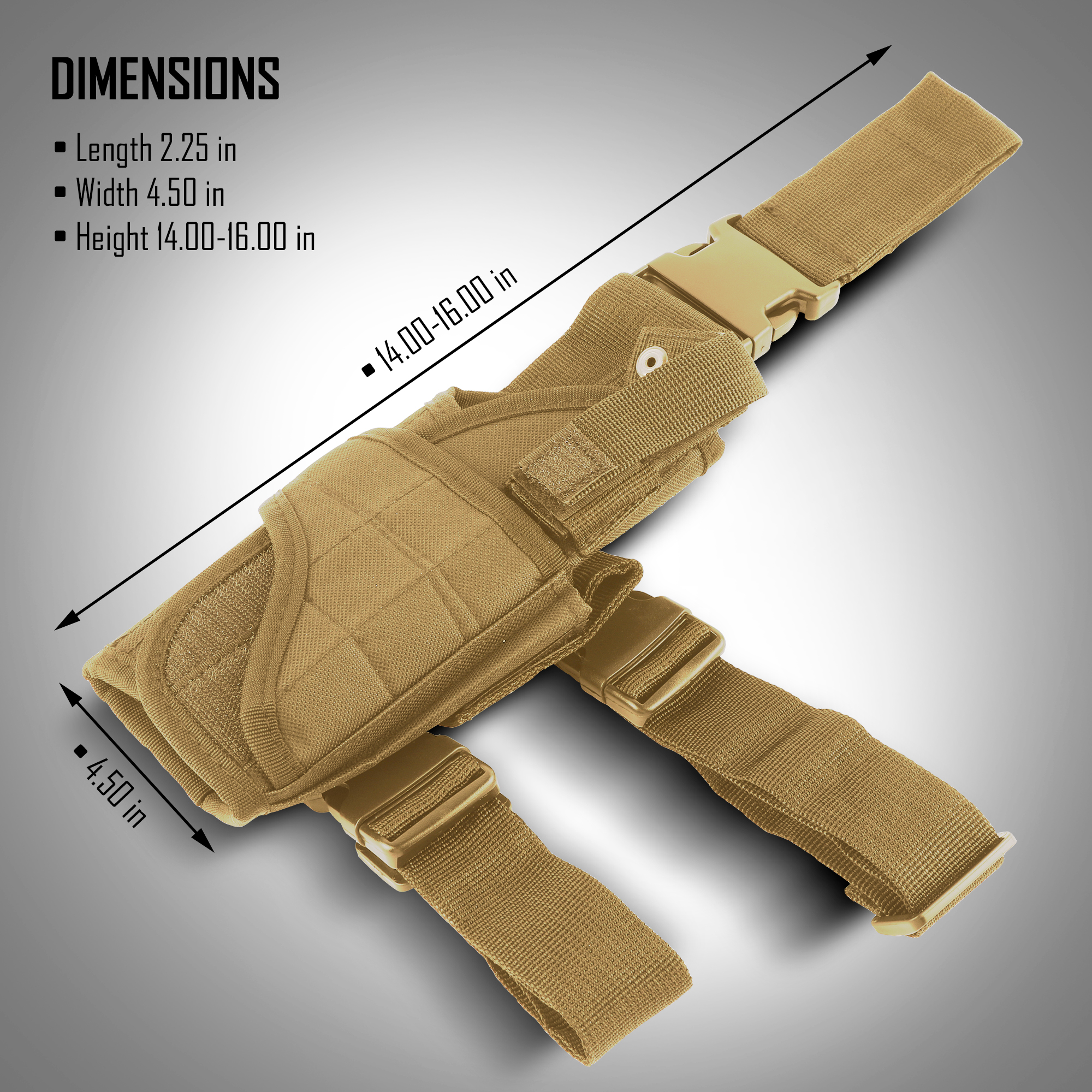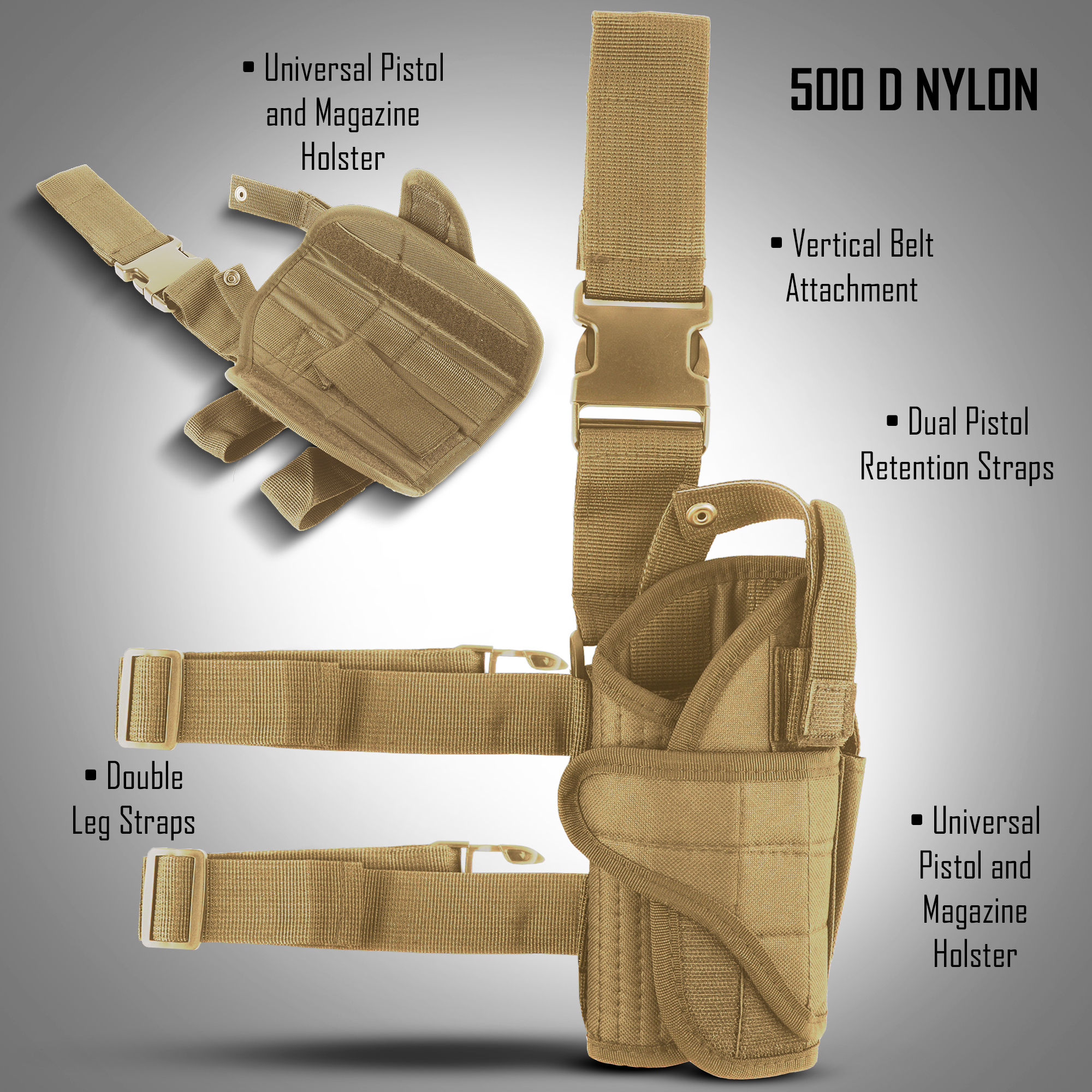Designed to withstand the toughest outdoor conditions, the military thigh holster is made of high quality 500D nylon.  It is waterproof, scratch-resistant, wear-resistant and completely adjustable. The thigh holster also allows you to easily adjust the retention strap, the magazine retention strap, the ride on the holster, and the muzzle height to meet your requirements.