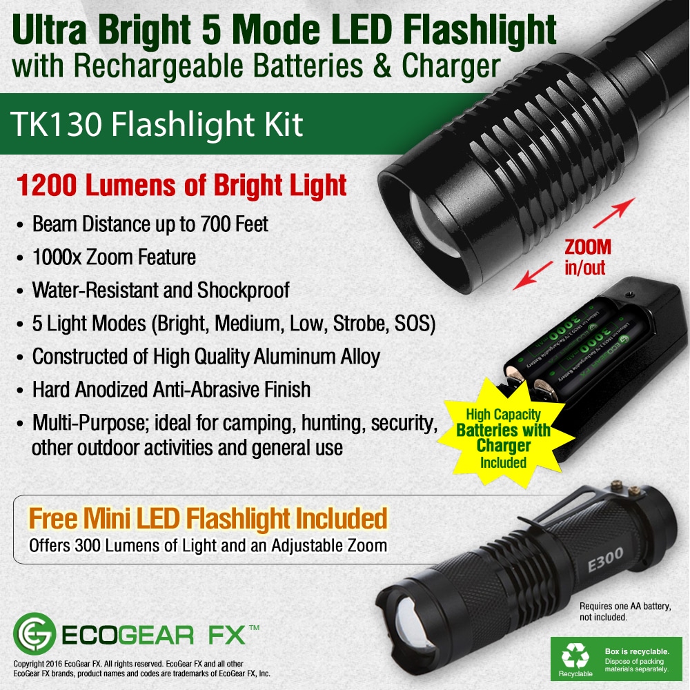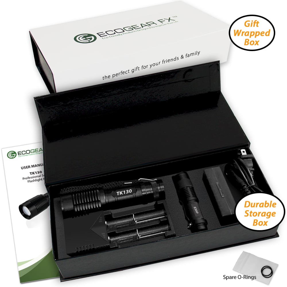 1 x TK130 LED Flashlight 1 x Attached Lanyard 1 x Rapid Battery Charger 1 x AAA Battery Holder 2 x Rechargeable Batteries 1 x Storage Case for Batteries 1 x Mini E300 LED Flashlight (battery not included) 1 x User Manual An excellent flashlight choice for camping, hiking, other outdoor activities, security and disaster prep kits!